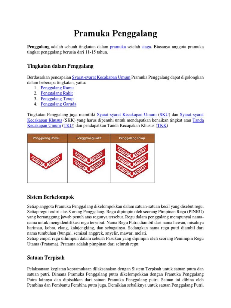 Penggalang Ramu Penggalang Rakit Penggalang Terap Setiap anggota Penggalang yang telah menyelesaikan SKU Syarat Kecakapan Umum berhak mengenakan TKU Tanda Kecakapan Umum sesuai tingkatannya yang dikenakan pada lengan baju sebelah kiri dibawah tanda barung berwarna. Istilah pramuka sendiri merupakan singkatan dari praja muda karana. Tingkatan Pramuka Berdasarkan Usia atau penggolongan pramuka berdasarkan umur tertentu dimulai dari pramuka siaga pramuka penggalang pengegak dan pandega hingga menjadi pembina pramuka kali ini admin pramuka Indonesia akan mengutip artikel dari PramukanetOrg sebagai berikut.