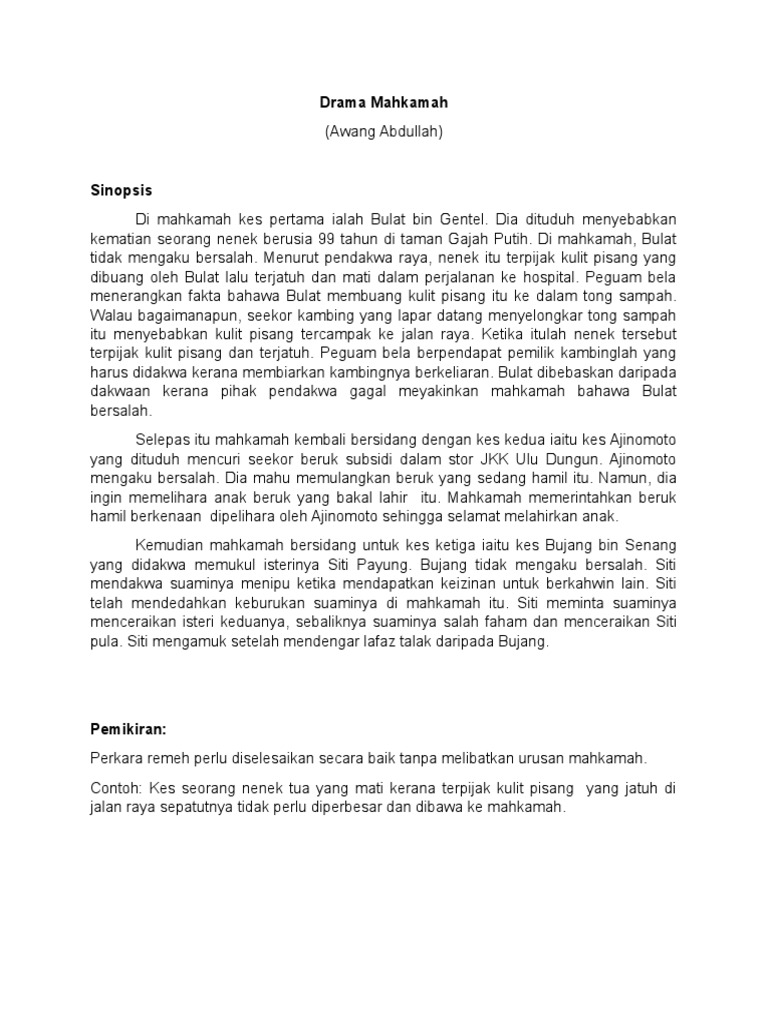 DRAMA MAHKAMAH SINOPSIS Latar tempat drama adalah di mahkamahDalam kes yang pertama Bulat bin Leper selaku tertuduh didakwa menyebabkan kematian seorang nenek tuaPada 10 januari 1988 antara pukul 8 pagi hingga 9 pagitertuduh telah menyebabkan seorang nenek tua tergelincir dan jatuh apabila terpijak kulit pisang yang dicampak oleh. Bahasa Melayu BM Gradelevel. Antologi Tingkatan 2 Baik Budi Bahasa Indah BahasaAnimasi DramaDireka cipta oleh Myteach Sdn BhdProduk dalam bentuk PowerPoint ATM Advance Teach.